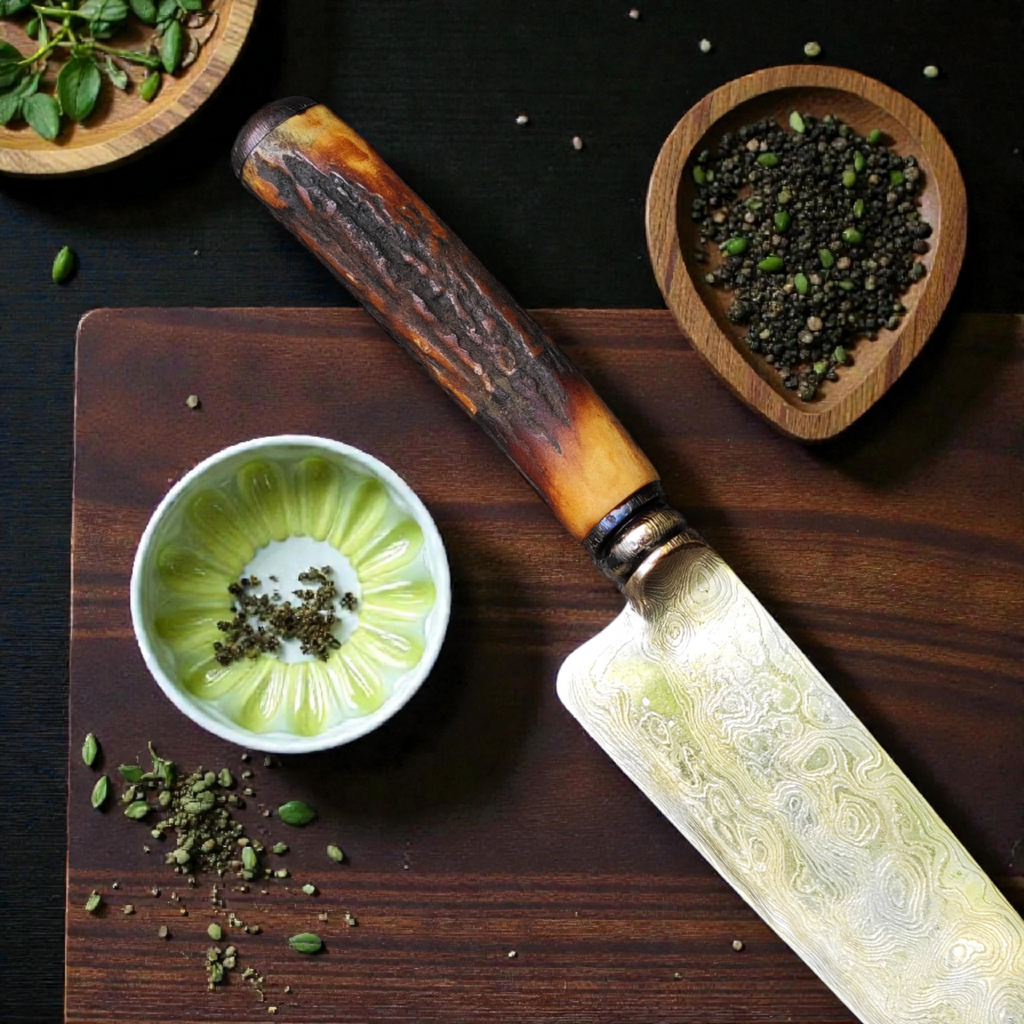 Uma faca artesanal em aço damasco de alto contraste , com padrão ALEATÓRIO , 9 polegadas de lâmina e 4 mm de dorso robusto , enriquecida por um acabamento especial banhado a ouro , que eleva ainda mais o nível de exclusividade e sofisticação desta peça.