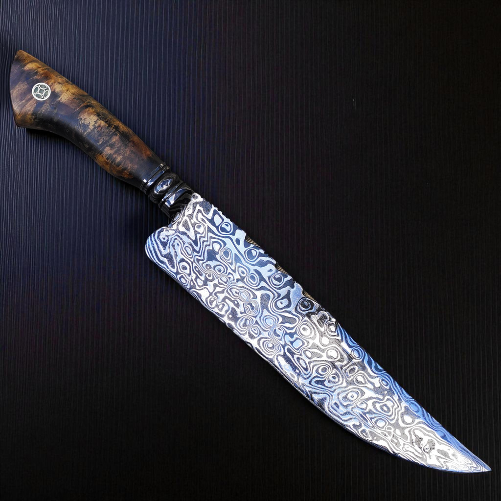 A Cutelaria Bravura apresenta uma verdadeira obra de arte: Uma faca artesanal em aço damasco de alto contraste, padrão ALEATORIO, com 11 polegadas de lâmina e 6 mm de dorso robusto.