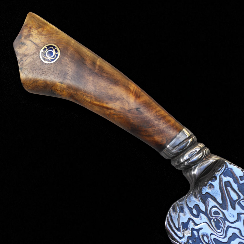 Cabo em rara radica de imbuia , madeira nobre conhecida por sua beleza e durabilidade.
