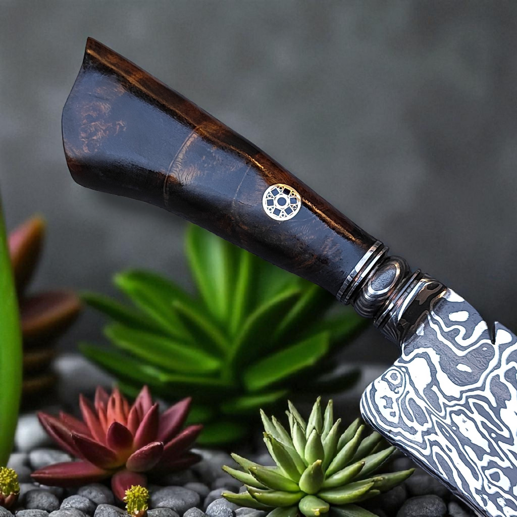 A Cutelaria Bravura apresenta uma verdadeira obra de arte: Uma faca artesanal em aço damasco de alto contraste , padrão ALEATORIO , com 9 polegadas de lâmina e 6 mm de dorso robusto.