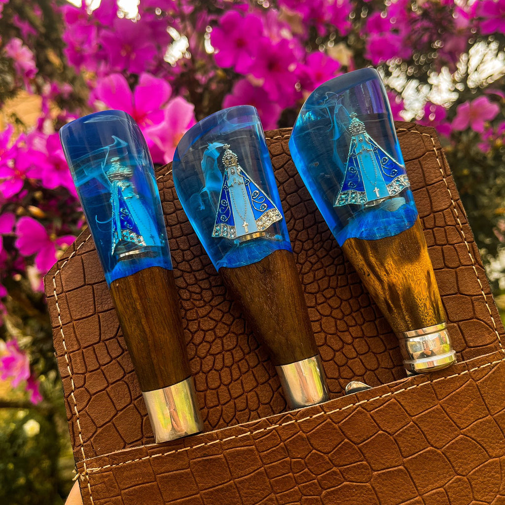 Celebre a tradição e a fé brasileiras com nosso exclusivo Kit Churrasqueiro Cabo Padroeira. Projetado para quem gosta de churrasco que desejam adicionar um toque de devoção e elegância às suas reuniões, este conjunto de três peças é uma homenagem à Padroeira do Brasil, Nossa Senhora Aparecida.